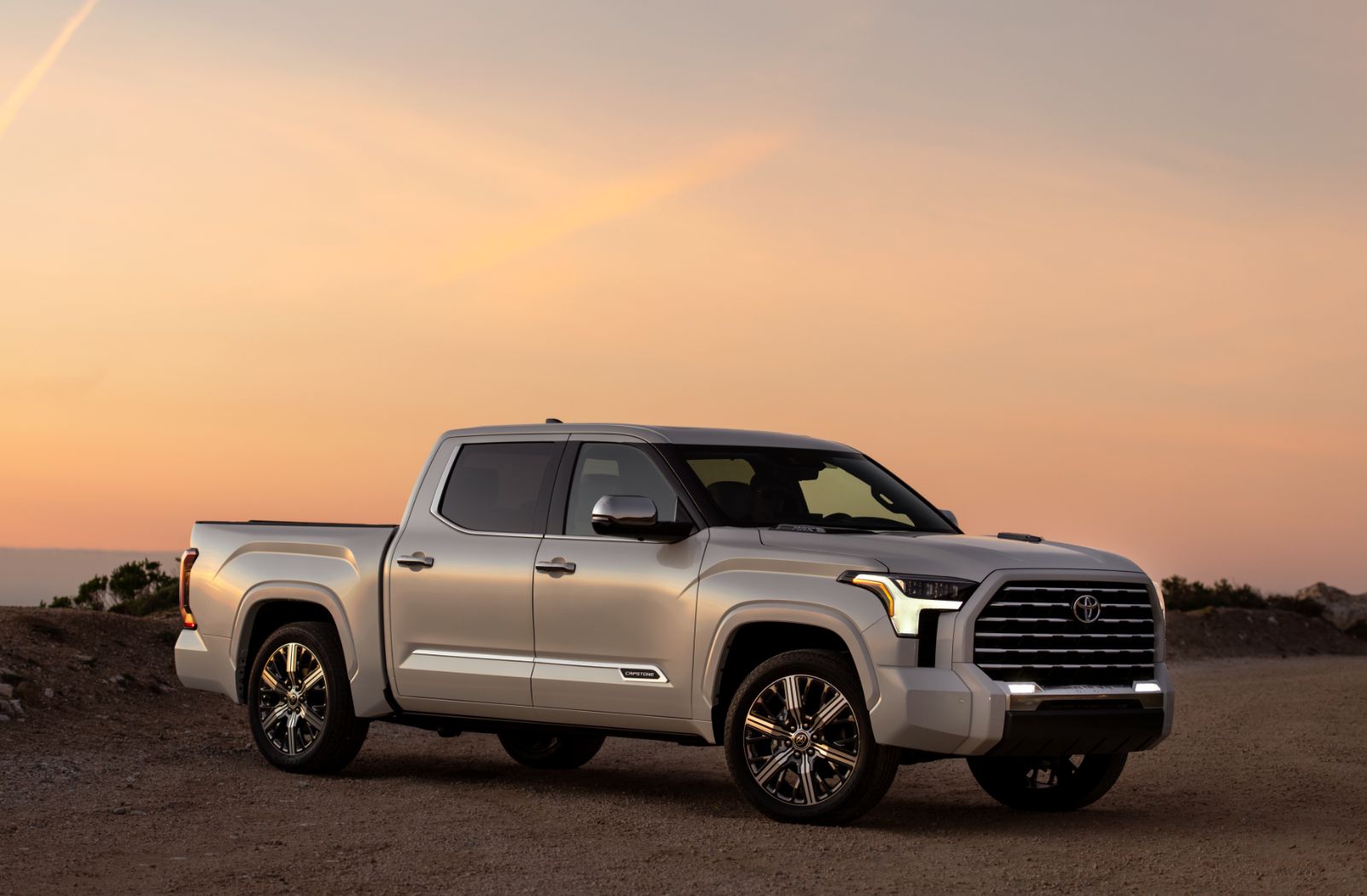 The Tundra Capstone is exclusively offered in a crew-cab configuration paired with a 5.5-foot bed, and it rides on standard chrome 22-inch wheels. Its grille is framed in body-colored trim—like the example shown in Wind Chill Pearl—and features chrome inserts.